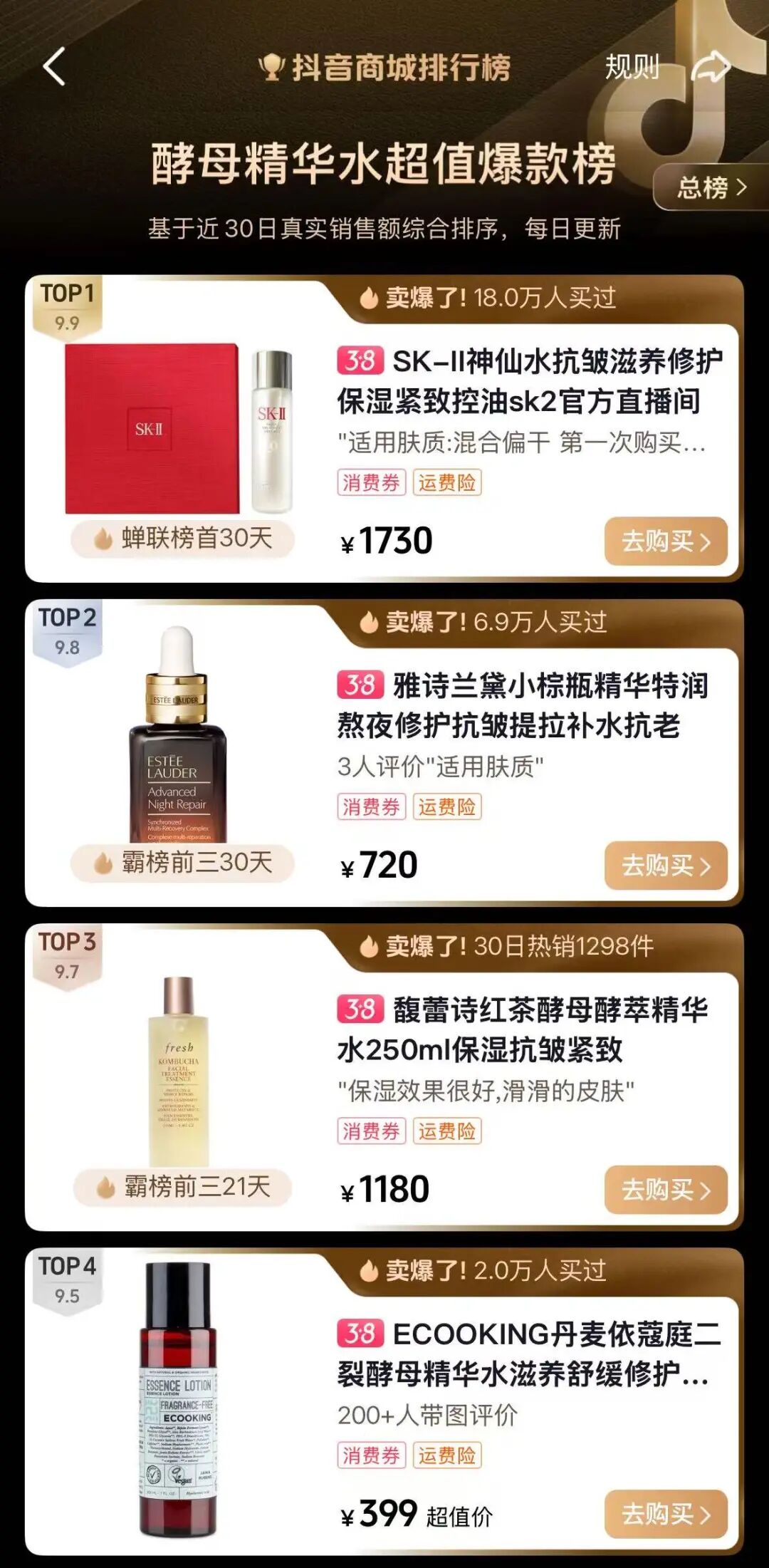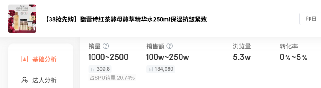时至今日,馥蕾诗仍然在吃古源系列和红茶系列的“老本”,价位相对较低、认知度更广的红茶系列也几乎成了馥蕾诗的标签。馥蕾诗抖音旗舰店的近期数据显示,仅红茶精华水单个链接就贡献了20%以上的销量,也使其成为馥蕾诗唯一进入抖音同类榜单前三的单品。