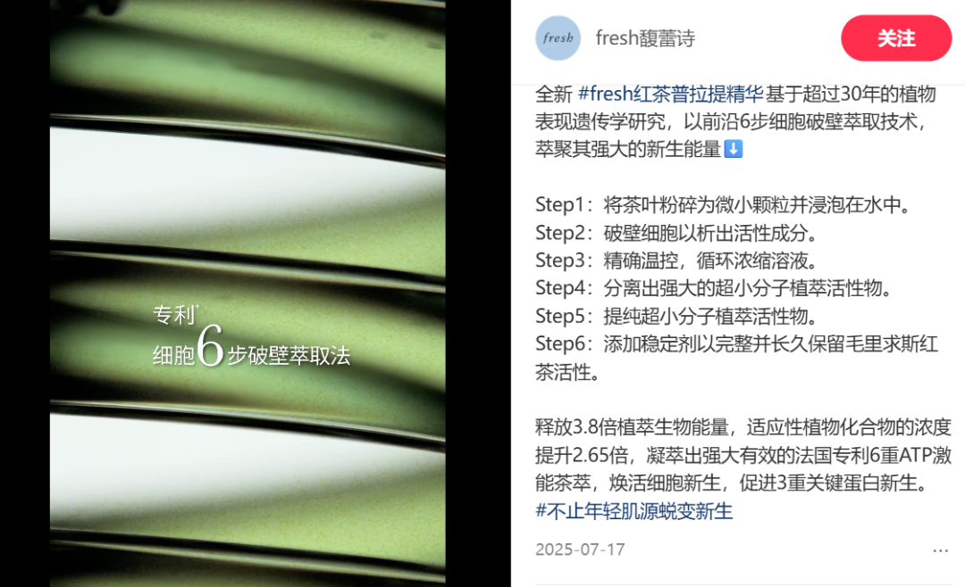 然而,馥蕾诗没有海蓝之谜“神奇活性精粹”那样的独家灵魂成分,专利技术集中在原料萃取和内容物释放这两个替代方案较多的环节,没法讲出更加诱人的故事。