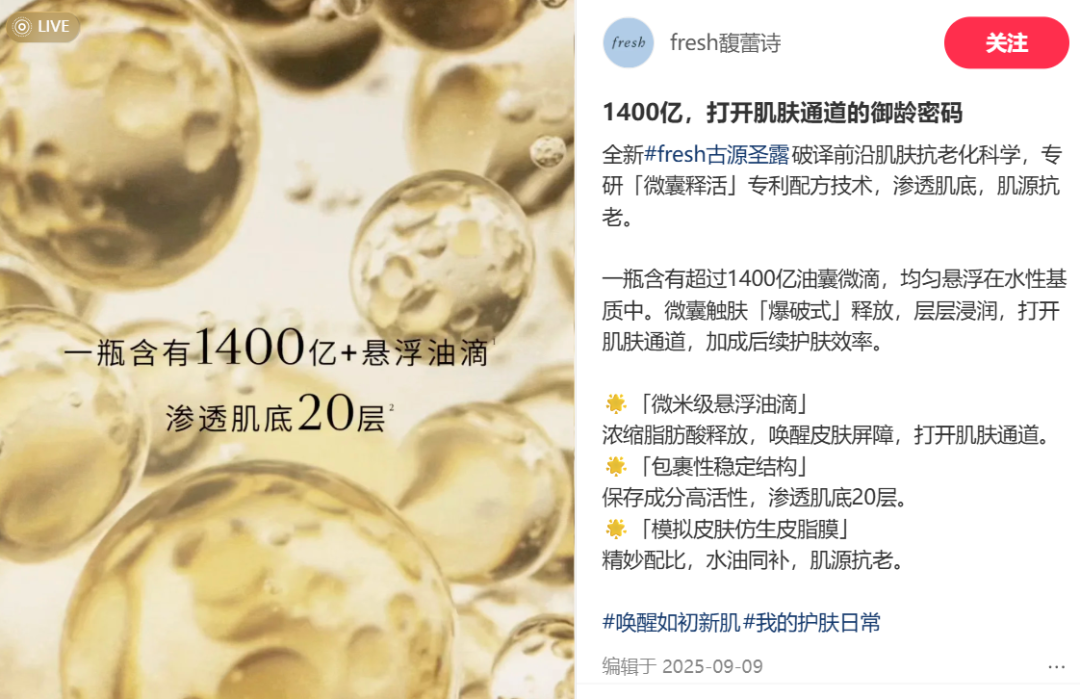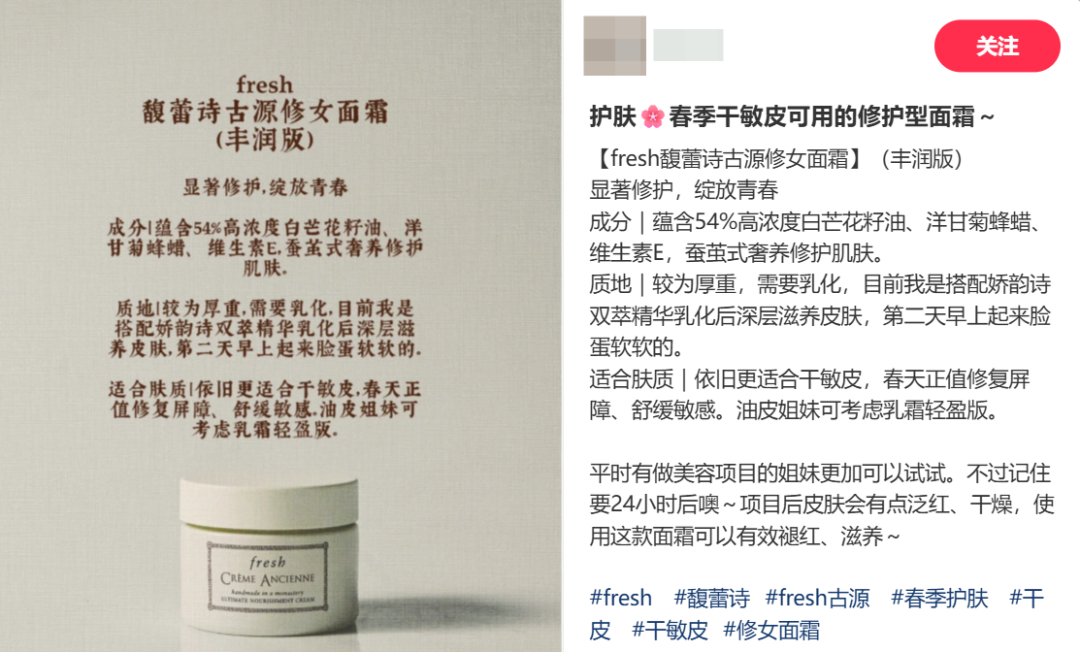 缺乏故事的馥蕾诗也没有找到独特的功能性赛道和营销发力点。例如,具有二十多年积累的古源修女面霜主打“蚕茧式奢养修护肌肤”,一度曾经尝试切入医美修护的精确场景,但又无法放弃“维稳”、“敏感修复”、“贵妇肤感”等范围更大的受众,同步投放了相关营销。
